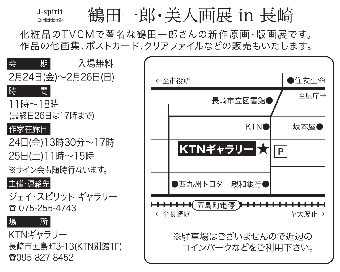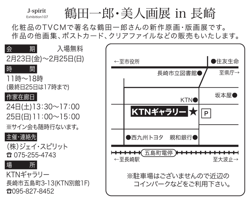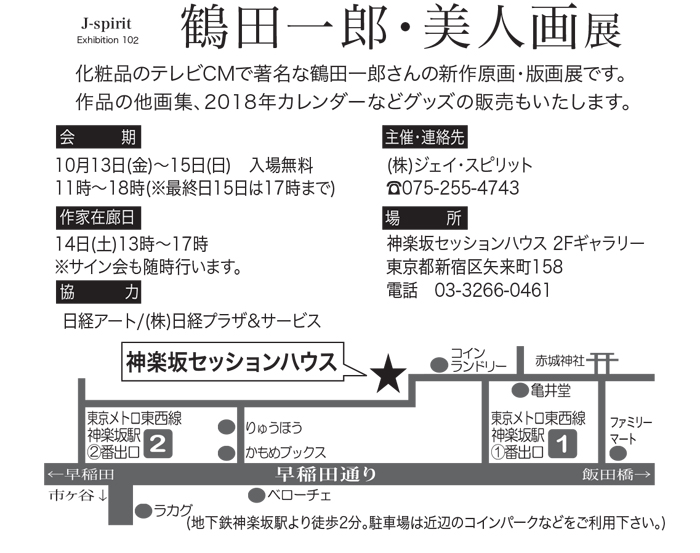 会場は地下鉄東西線「神楽坂」駅より徒歩2分といいう交通至便のところにございます。2018年版の壁掛け、そして復活いたしました卓上カレンダーもございますので、鶴田さんの在廊時にはサイン入れもさせて頂きます。例年通り多数の鶴田一郎さんファンのお越しを江戸文化の香る神楽坂にてお待ちしております。