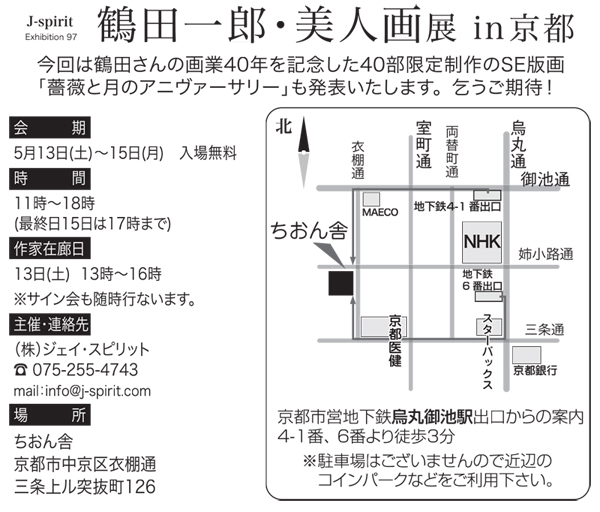 今回も新作原画、版画を予定しております。また15日には葵祭の巡行もございますので、新緑の京都観光なども兼ねて全国よりのファンの皆様のお越しをお待ちしております。